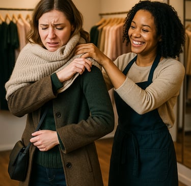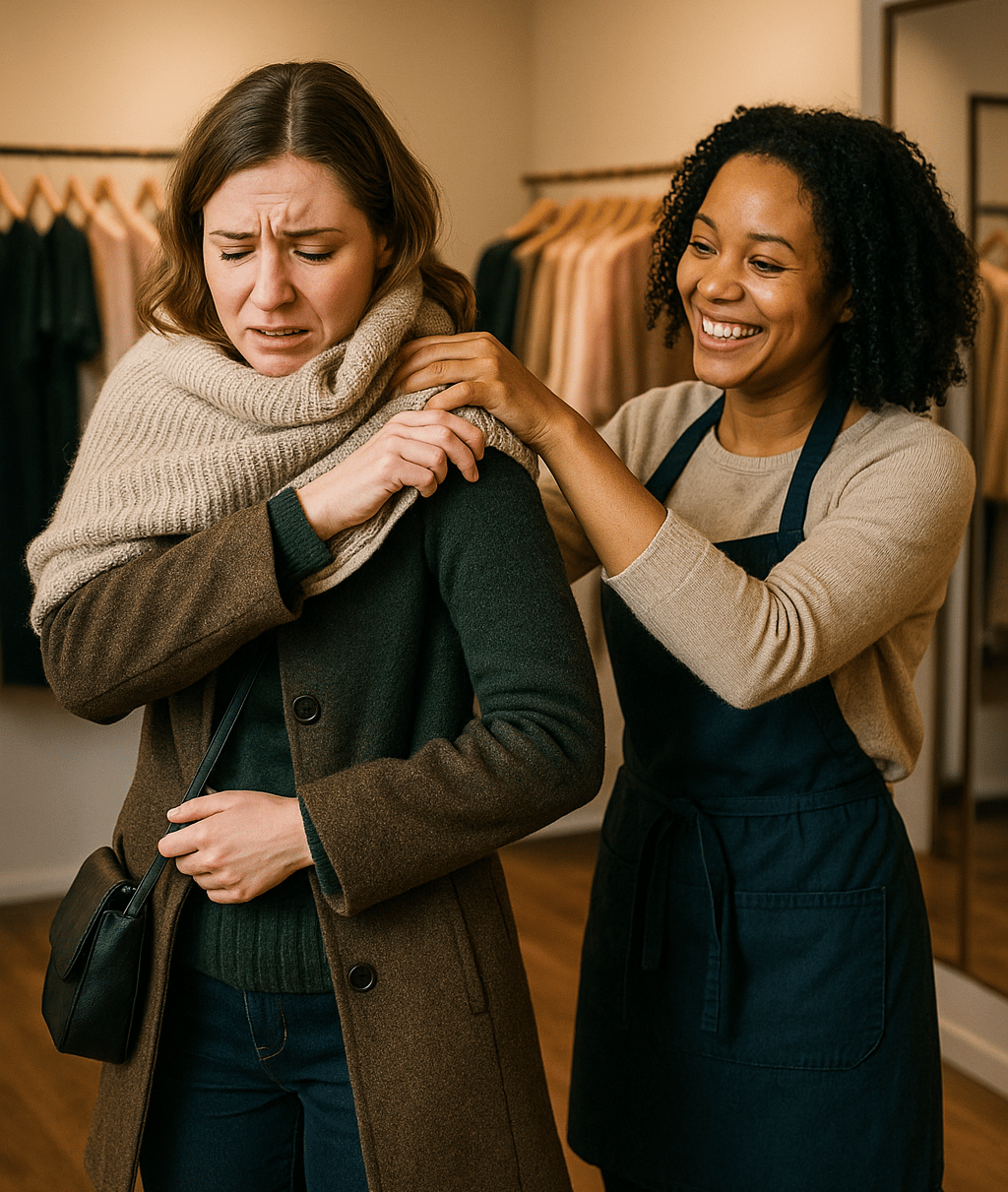 The manager, who had been watching from the back with arms folded smugly, steps forward. “Of course,” he says. “We want you to enjoy the rest of your shopping experience here — in every other store in the mall.”