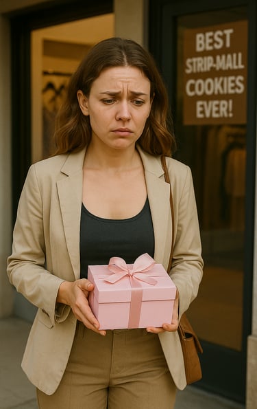 “We baked these just for you,” the clerk chirps. “Our famous mall cookies. Chocolate chip — made with real butter!”